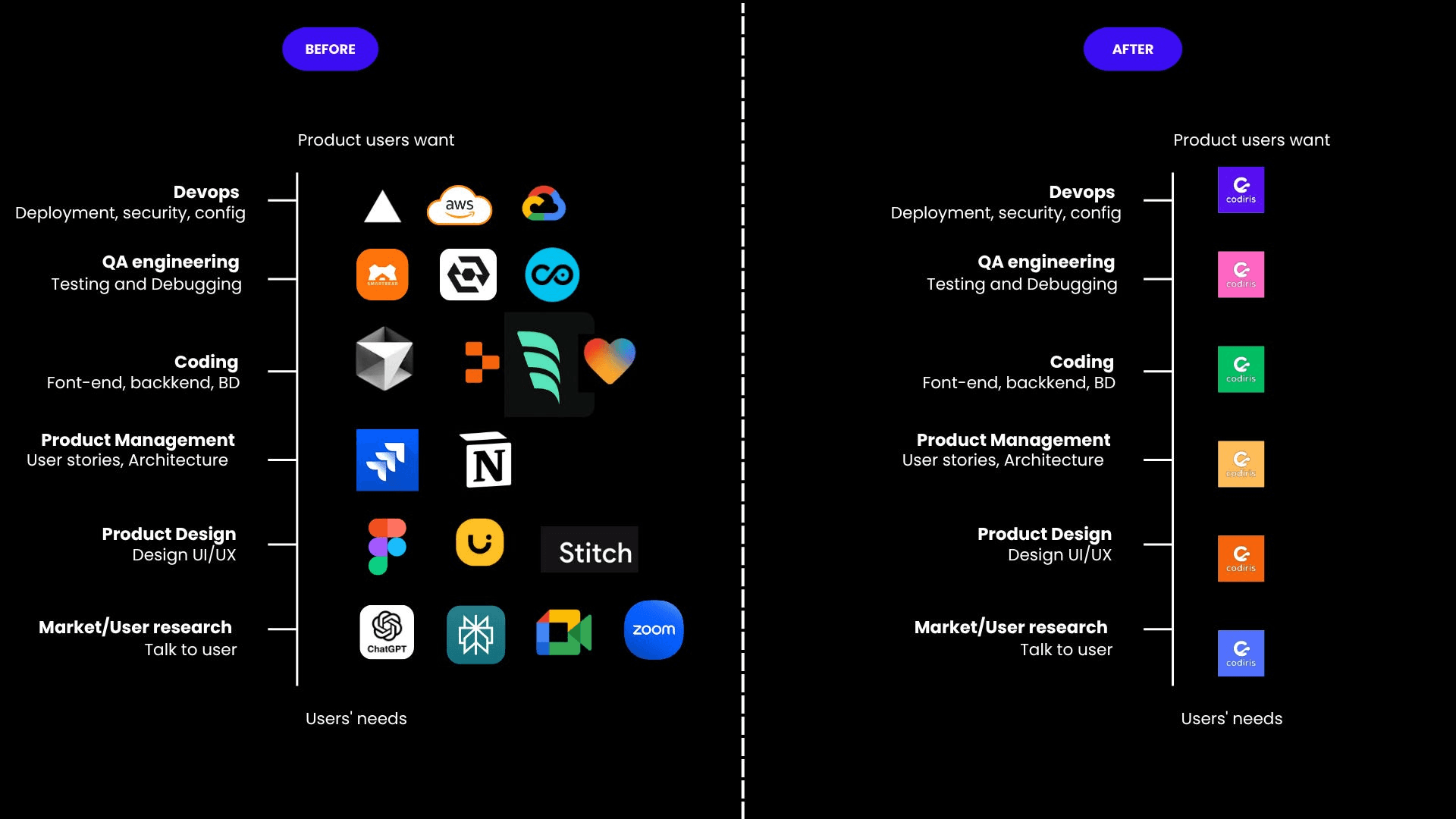 Codiris doesn’t just code it talks to your users. It conducts interviews, sends surveys, and extracts actionable insights to help you build what people truly want.Actionable Framework: